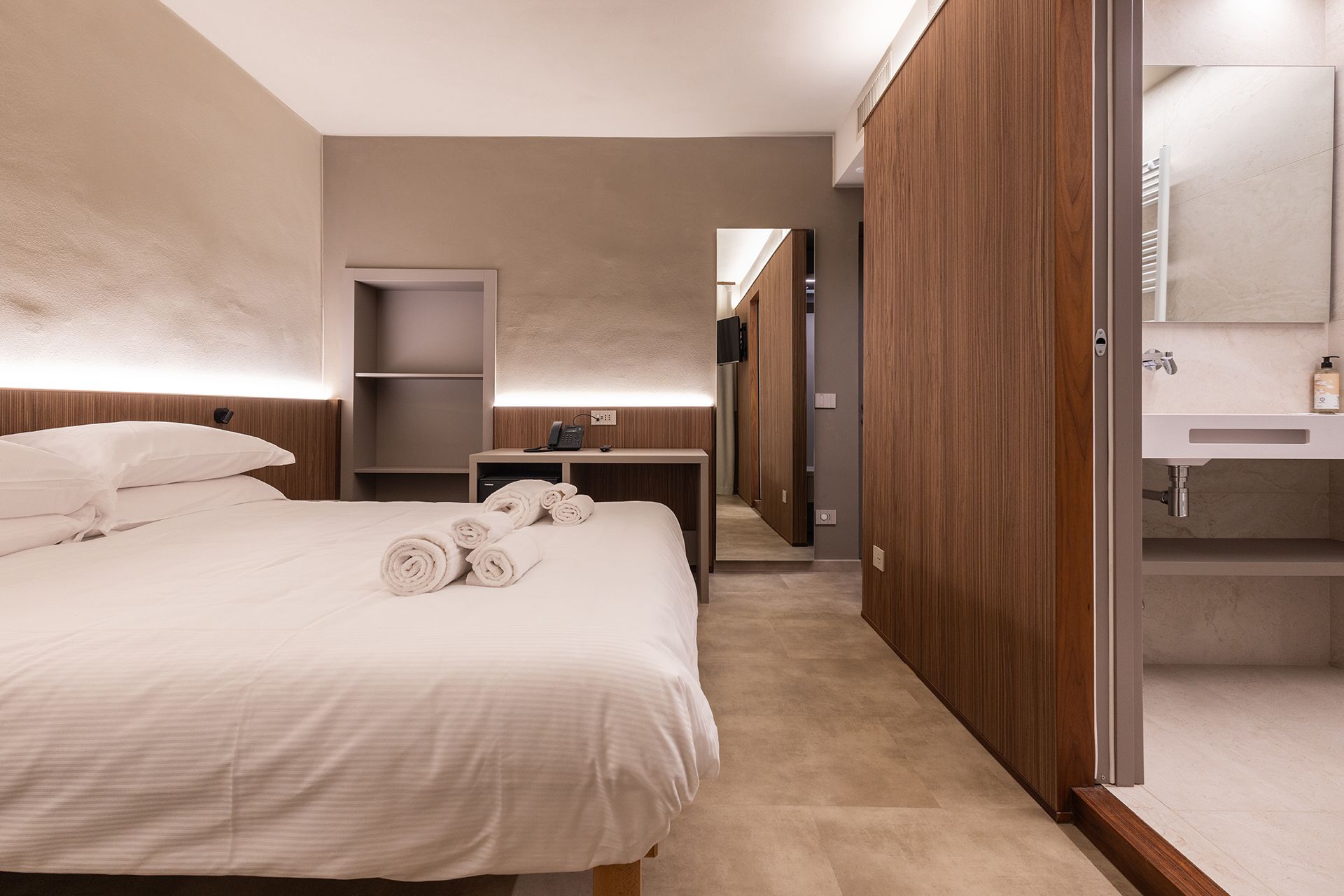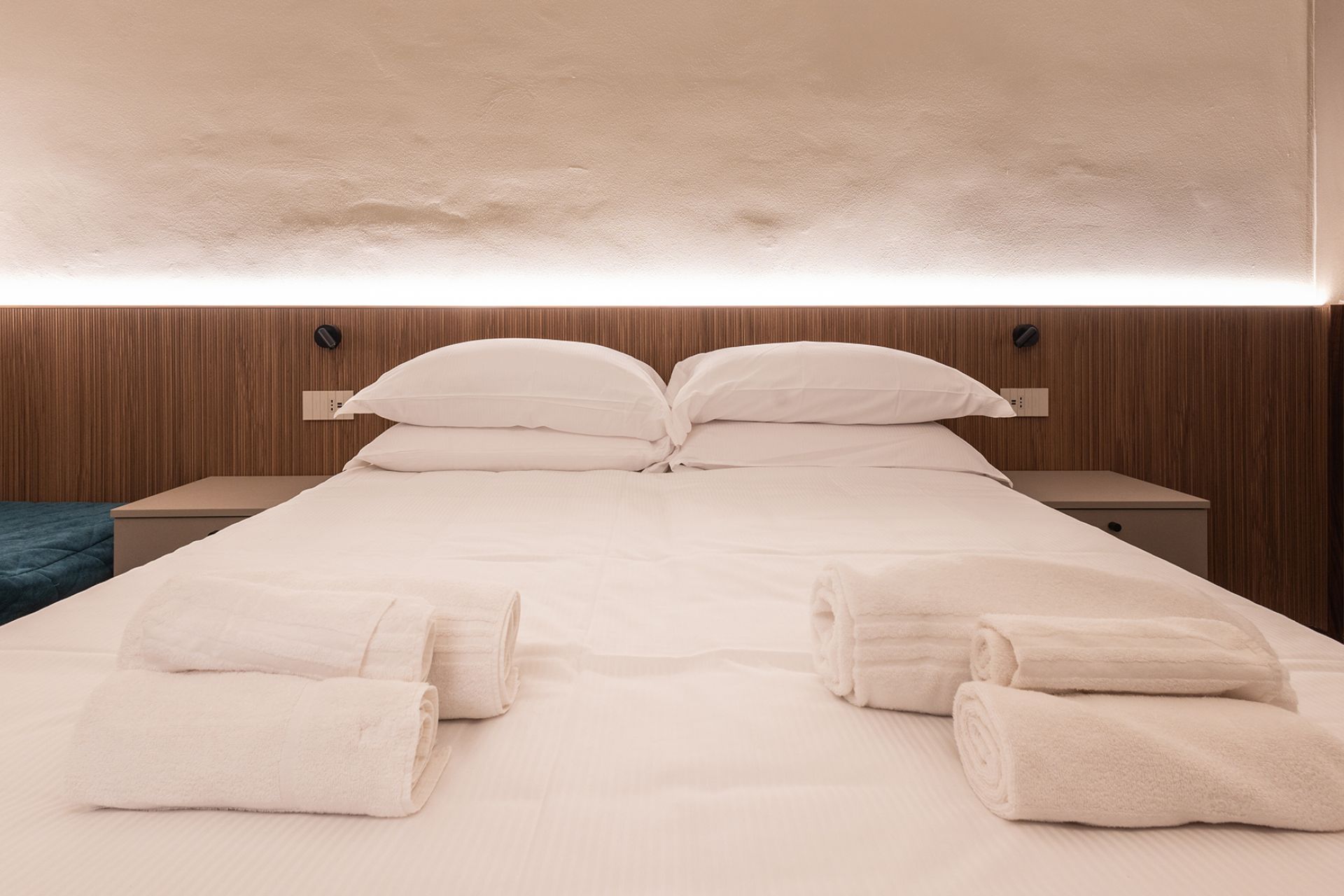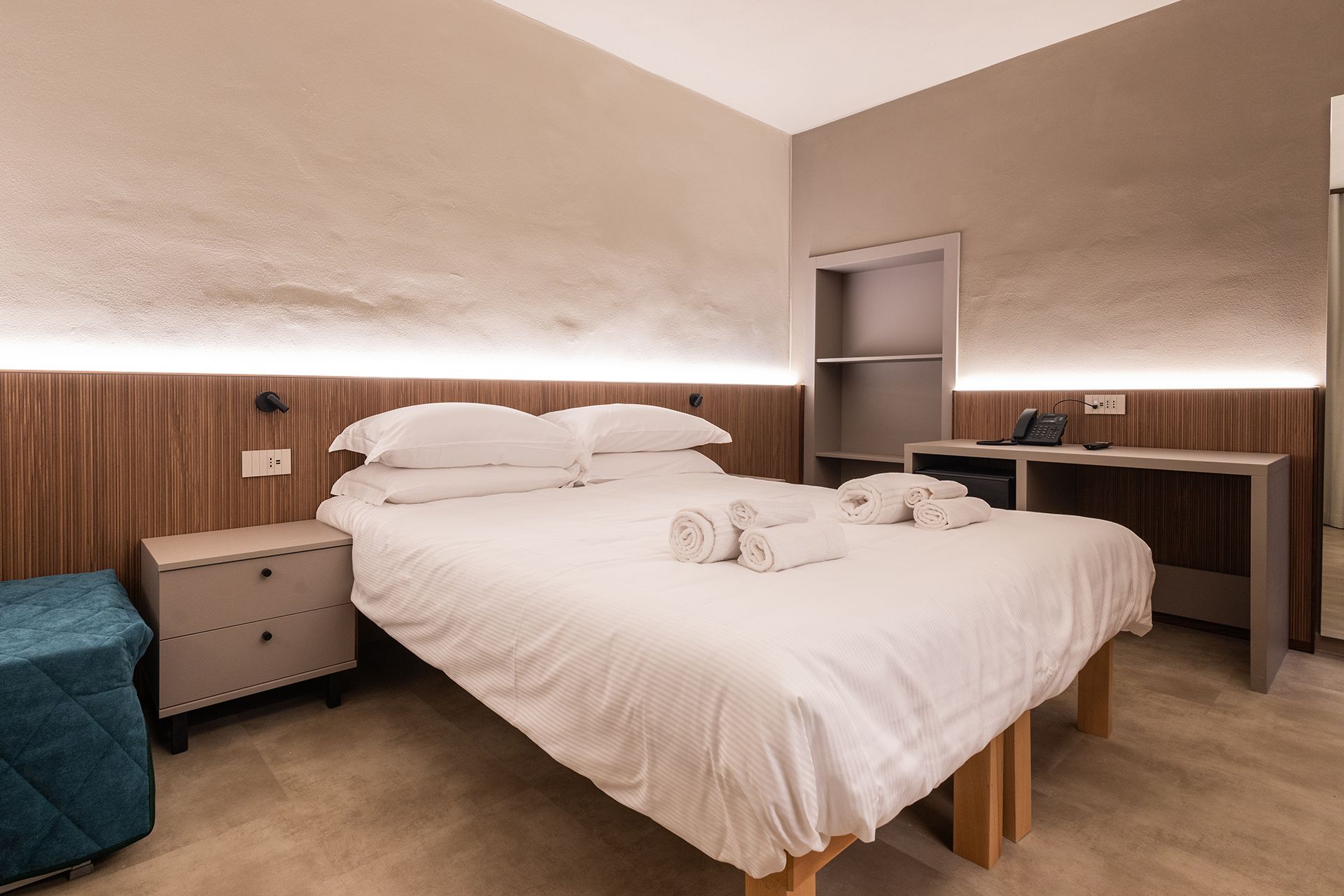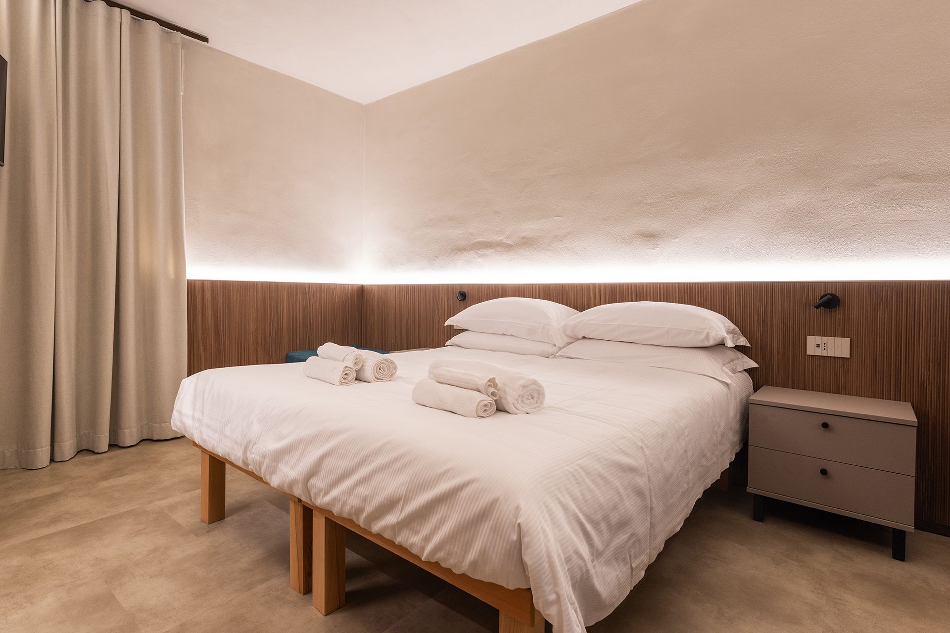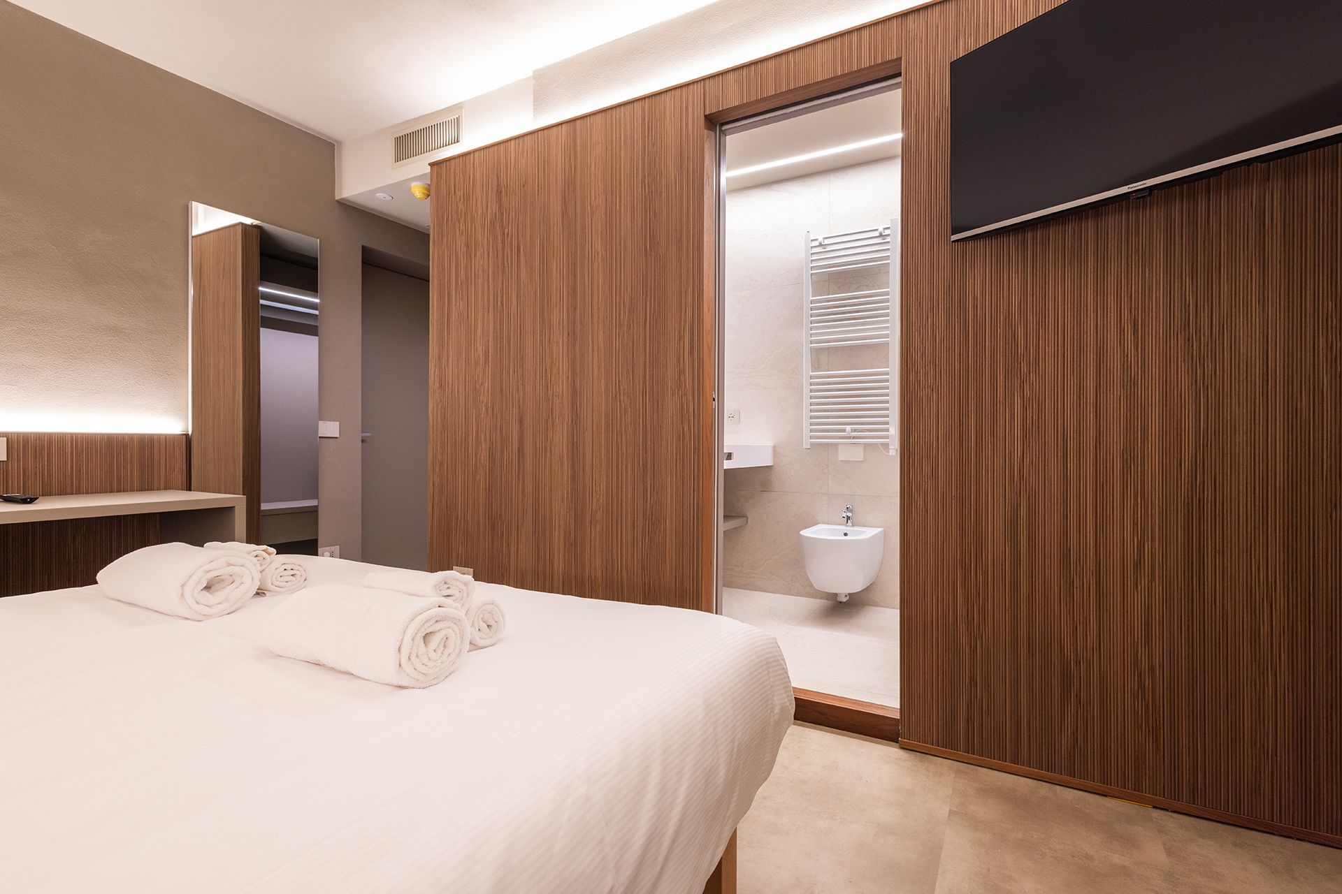 Camera matrimoniale con letto King (180 cm) divisibile in due singoli e pouf letto aggiuntivo (fino a 3 persone). Design contemporaneo con boiserie in legno cannettato, bagno in grès 60x120 con doccia walk-in, armadio open closet.