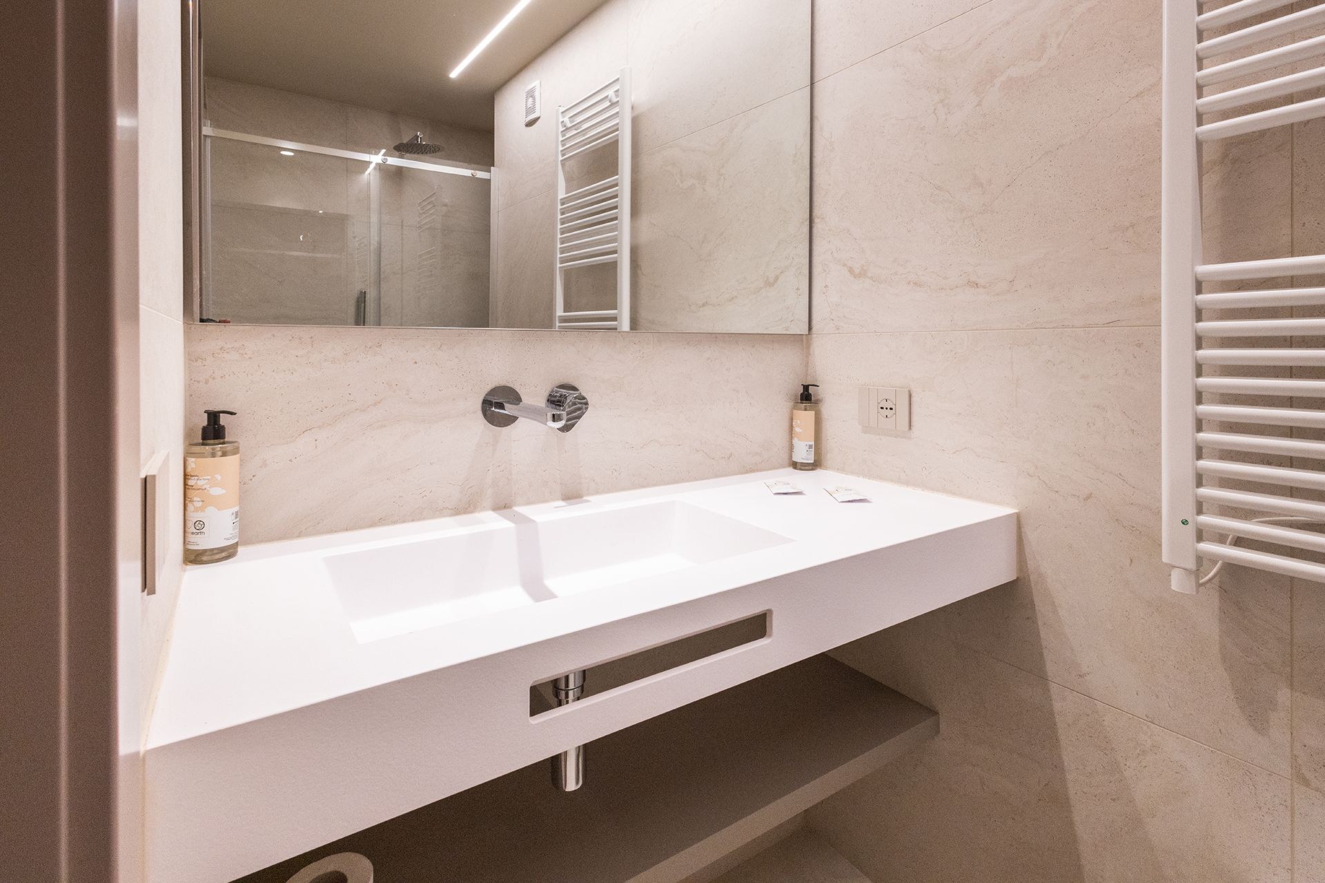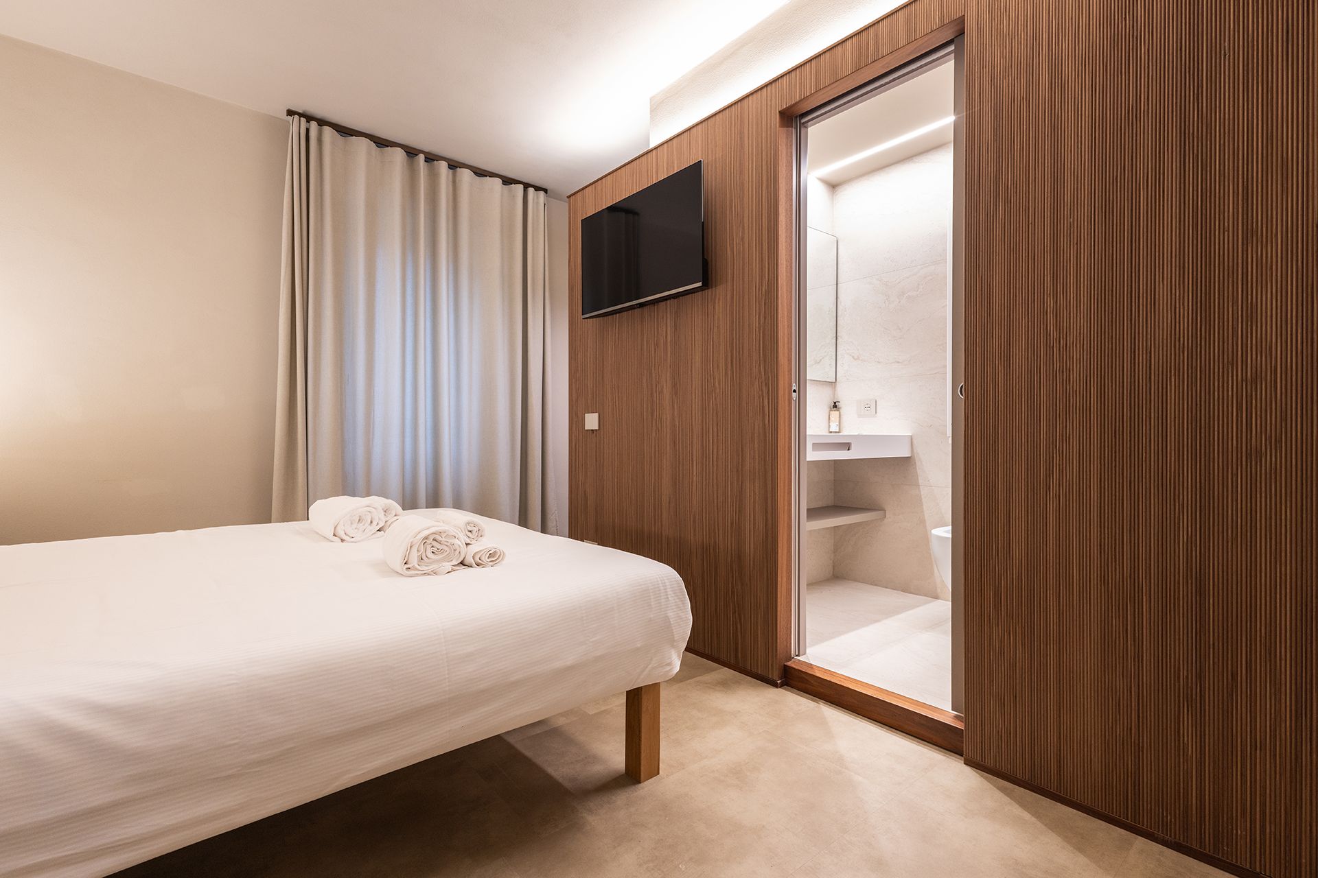 Camera matrimoniale con letto King (180 cm) divisibile in due singoli. Design contemporaneo con boiserie in legno cannettato, bagno in grès 60x120 con doccia walk-in, armadio open closet.